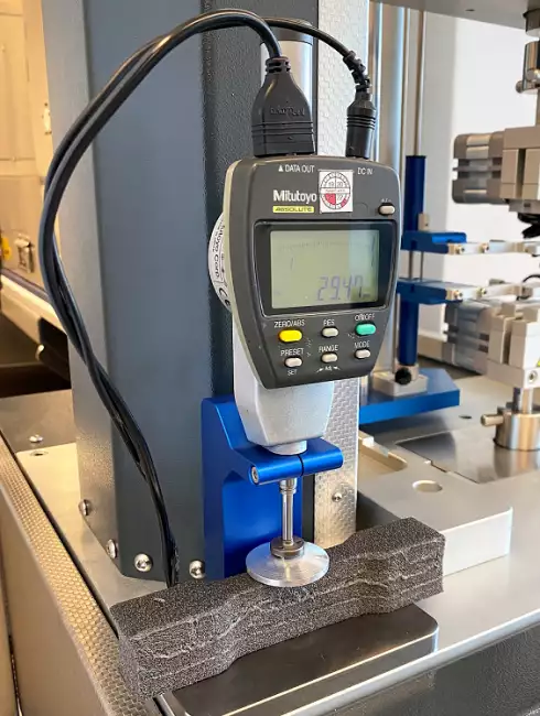 Thickness meter for high-thickenss samples A thickness gauge version with 50 mm stroke is available to allow the measurement of high thicknesses. The device allows to measure the thickness of specimens in expanded material.