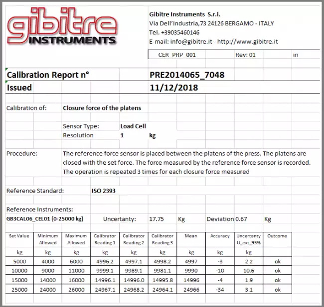 lab press force control option: Laboratory press with clamping force control. Examples of closing force calibration certificate.