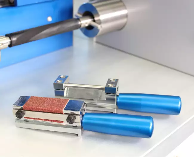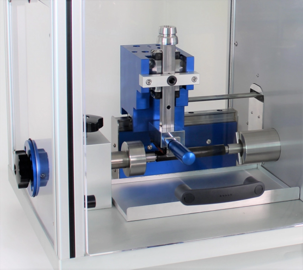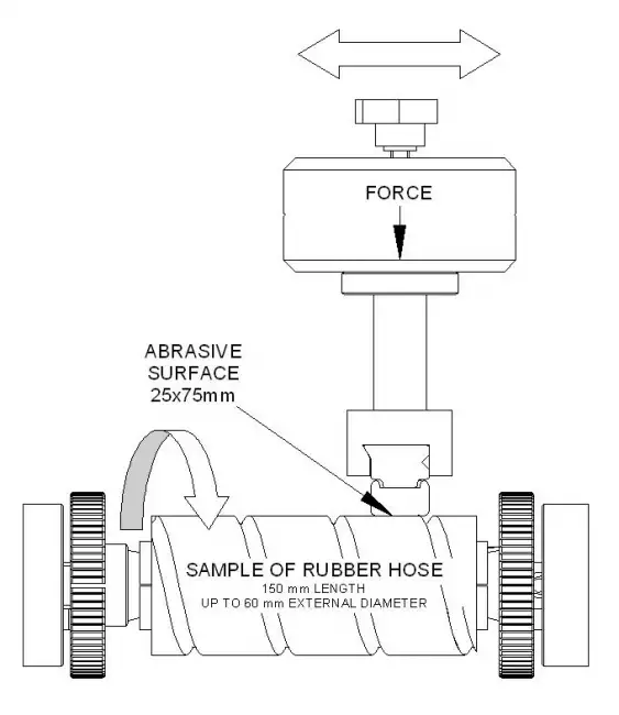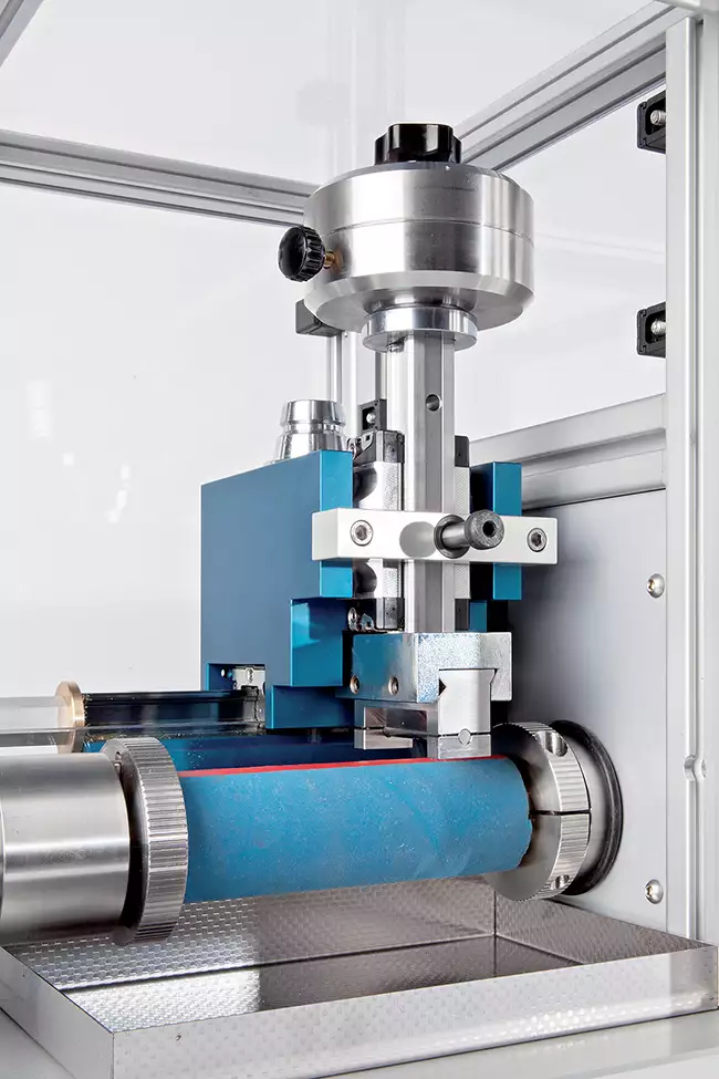 | Standard abrasion tool Abrasive paper 80 Grit, coarse AL203 emery cloth is firmly affixed to a hard surface with 25 x 75 ± 5 mm dimension. Other abrading tools on demand. | Rotation speed of the hose Between 0 and 80 RPM. Digital setting via control display. | Sample holder The fixing device for the hose has been specially designed to permit the easy and quick change of the hose. | Set of number of cycles