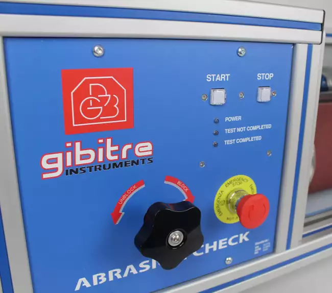 Gibitre’s abrasion tester is a professional testing tool for comparative evaluation of abrasion resistance on specimens made of vulcanized rubber, plastics, and other materials. A cylindrical specimen, molded or punched from the finished product, is pressed under a defined load against a rotating drum lined with certified abrasive paper, following the standard test cycle.
