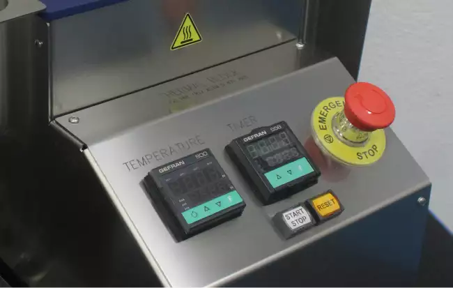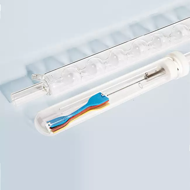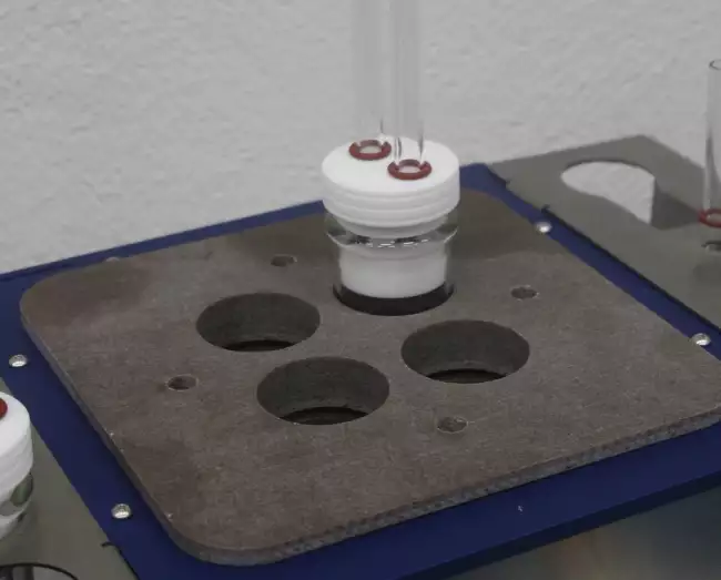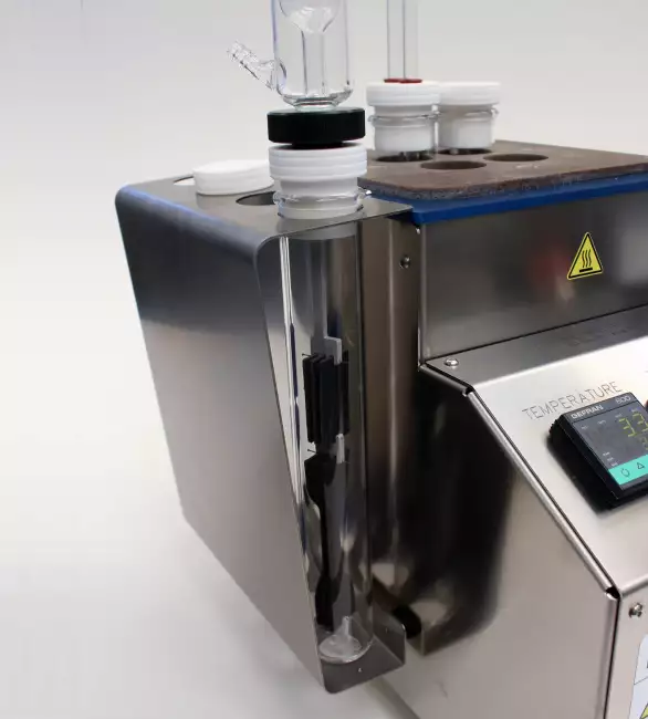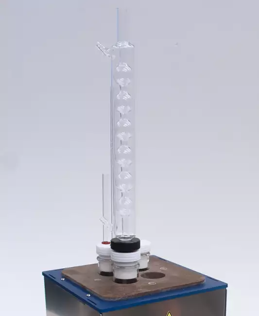 | Test stations 4 glass tubes with a diameter of 38 mm and a length of 300 mm. Each tube can hold up to 6 samples (ISO 37 S2 type). | Condensation Columns A condensation column cooled with running water can be applied to each test tube to prevent evaporation of the test liquid. | Heating system The thermal resistance surrounding the round-shaped aluminium block ensures uniform heating of the system | Temperature control range From room temperature to 250°C (Resolution 1 °C) | Timer for set of test time Timer with hour and minute settings and automatic heating shut-off at the end of the set time. Set time: from 1 min to 700,000 h |