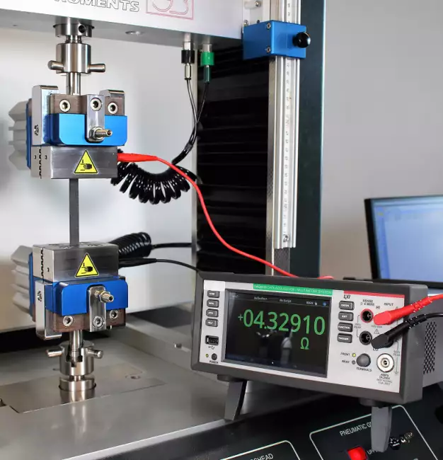- Electrically insulated clamps to allow the measurement of the electrical resistance of the specimen during the applied deformation cycle.