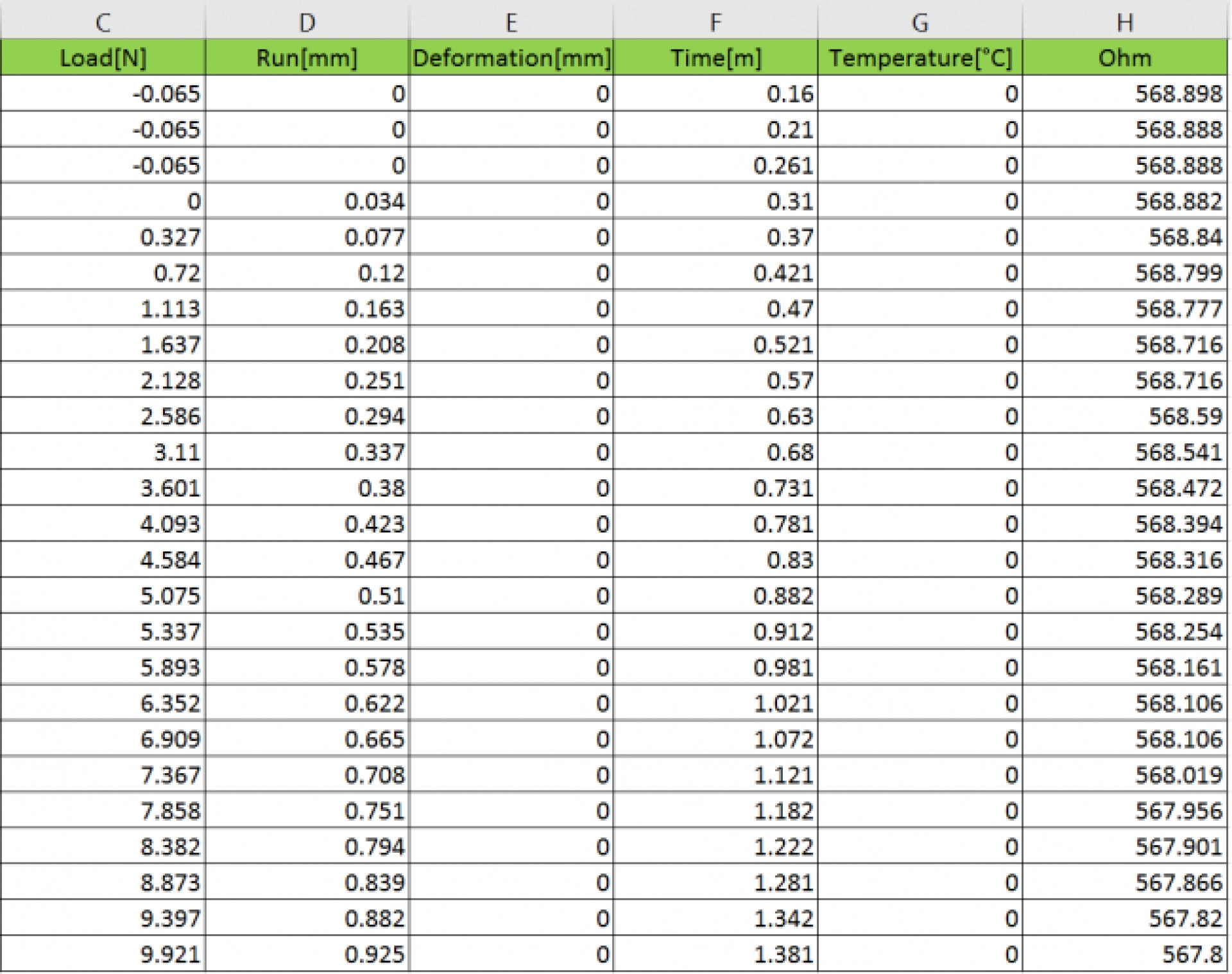 For each test point, the file reports: Force, Effort, Deformation, Traverse Displacement, Time from Start, Electrical Resistance, Temperature.