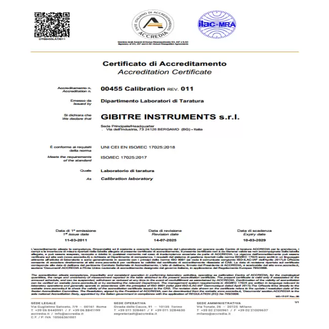 • ACCREDIA calibration certificate issued by Gibitre's ISO 17025 accredited laboratory