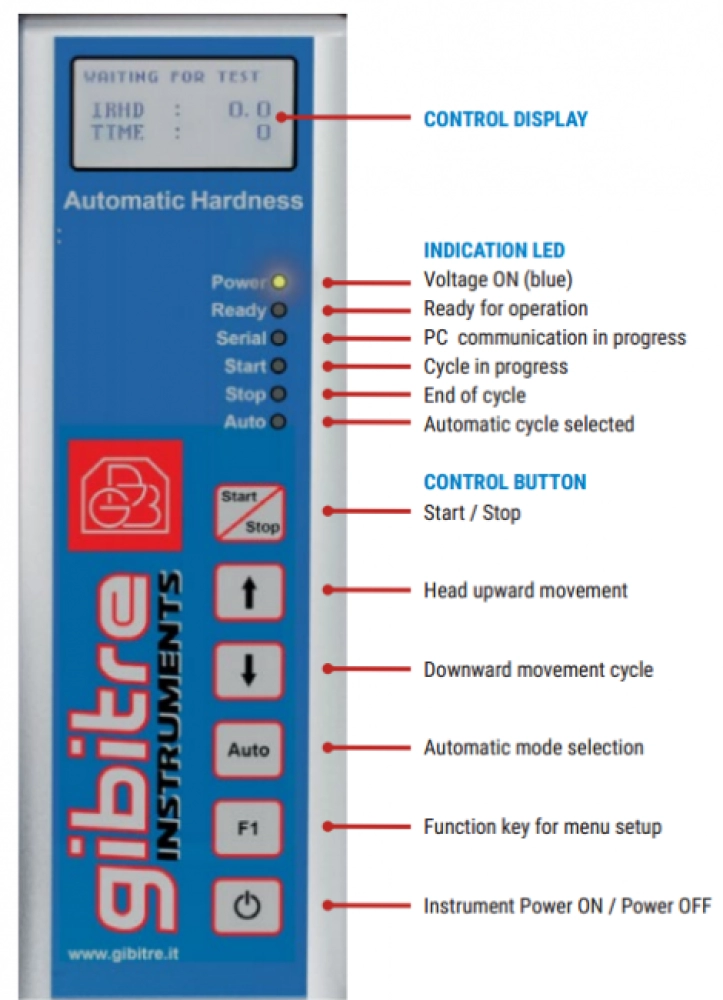 The keypad located in the front permits to control the status of the instrument and to perform basic operations (Start, Stop, up and down displacement of hardness unit, instrument setups, etc).