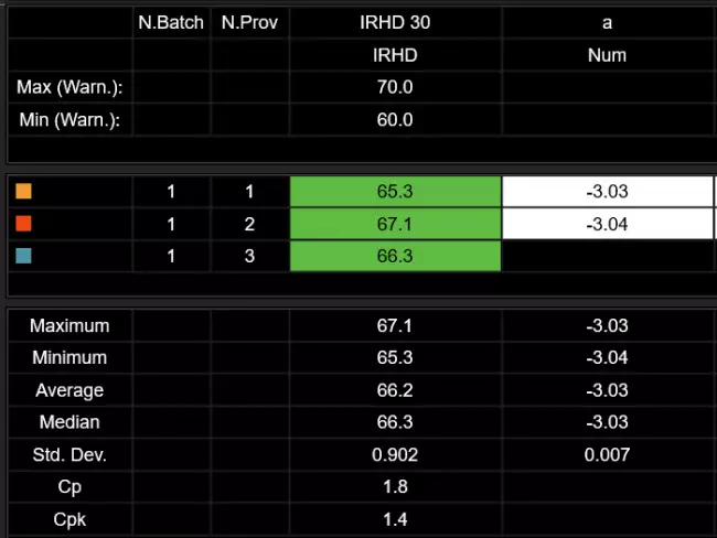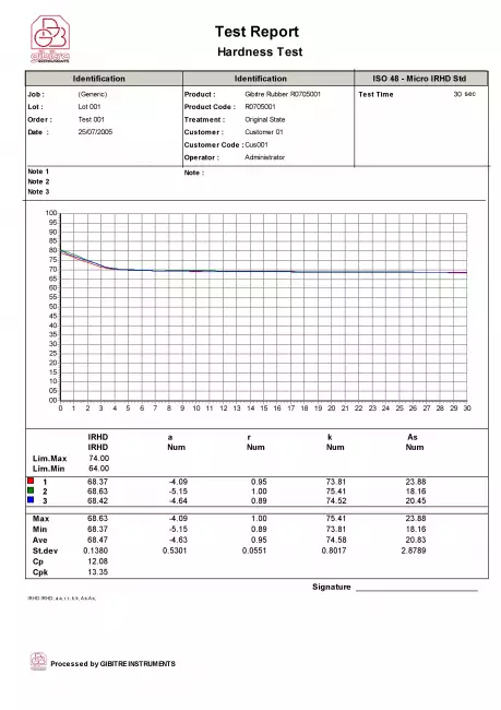 Results storage  The test result sand the curves are stored in the SQL Gibitre database which is installed in combination with the software  Regression curve analysis  Angle coefficient of Regression curve  Hysteresis analysis (irhd tests)  % recovery after set time after main force removal  Data analysis  Mean, std. Dev., min, max, Cp, Cpk of test results. X-Chart and Gaussian distribution  Graphs  Rubber Relaxation curve (hardness
