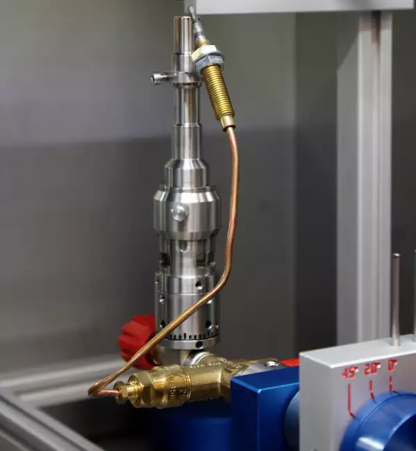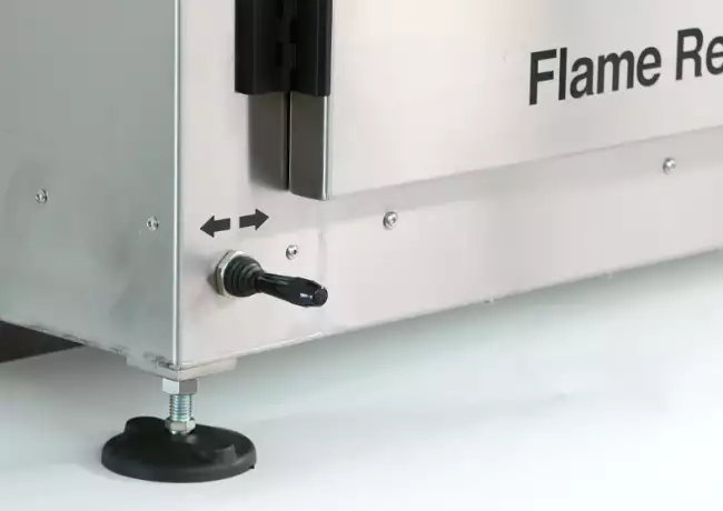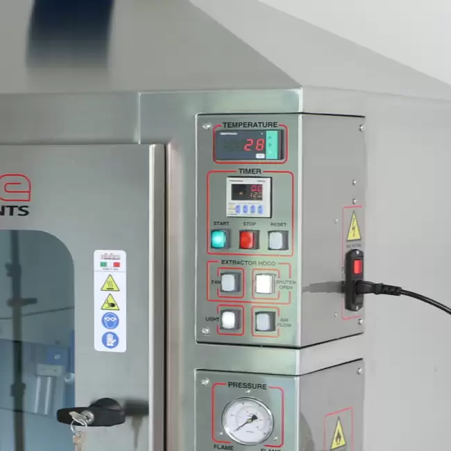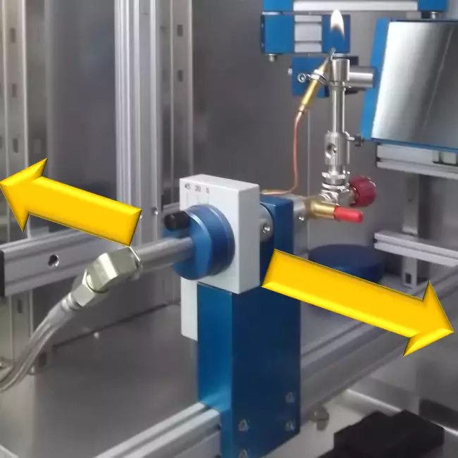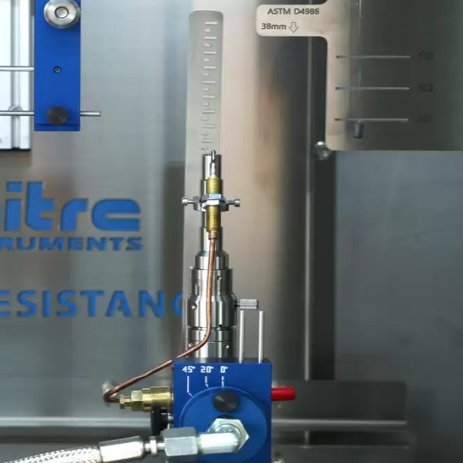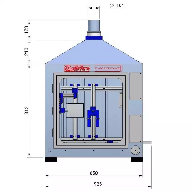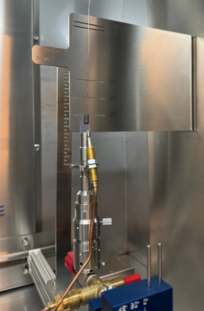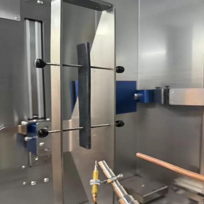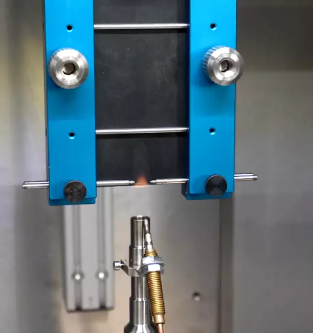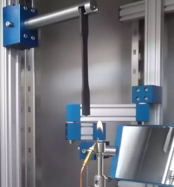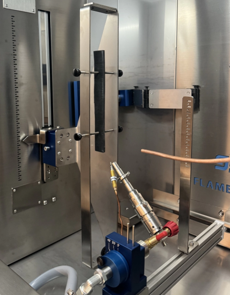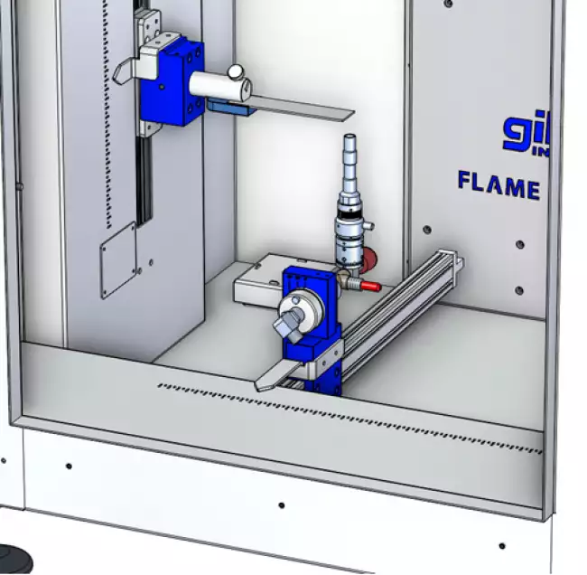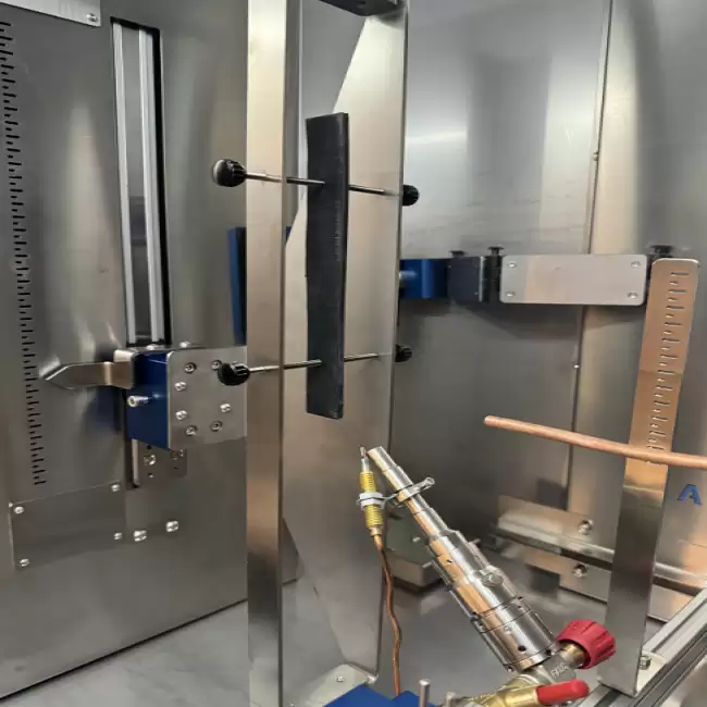 | Types of test that can be performed HBF (Horizontal Burning Foamed Material), HB (Horizontal Burning), MVB (Material Vertical Burning), VB (Vertical Burning) | Test Cabinet Stainless steel with a volume of 0.5 m3 with inspection window and light for internal illumination. | Burner Conforming to ASTM D5025 and CEI IEC 60695-11-4 standards. With support for flame angle set (0°, 20°, 45°). | Temperature Control Internal Digital thermometer in conformity with ASTM D 5207 standard | Gas flow Regulation (Methane) Integrated Flow meter | Timer Digital Timer with 0.1 sec. resolution. The timer permits to set the flame exposition time. At the end of the count down for flame exposition, the timer permits to count flame extinction time. | Slide for the displacement of the Burner during the test The slide, controlled by a pneumatic cylinder, allows the burner to be moved from outside the chamber via the control knob. | Slide for the regulation of the vertical position of the sample The slide, which is controlled by a pneumatic cylinder, allows the distance between the specimen and the flame to be controlled during the execution of the test using the adjustment knob. | Aspiration of Fumes Exhaust fan to remove fumes at the end of the test |