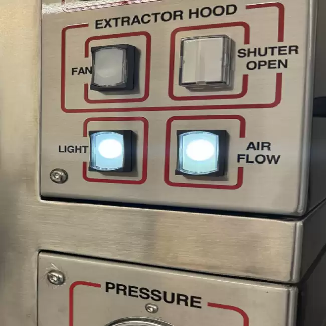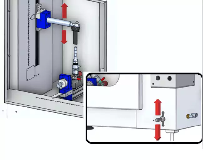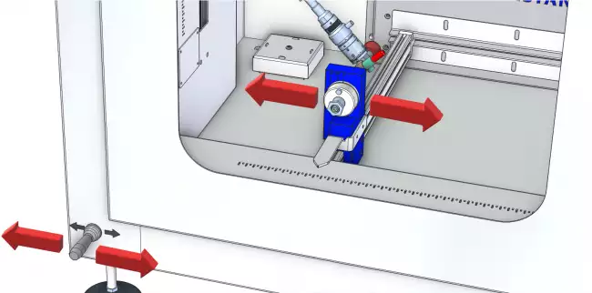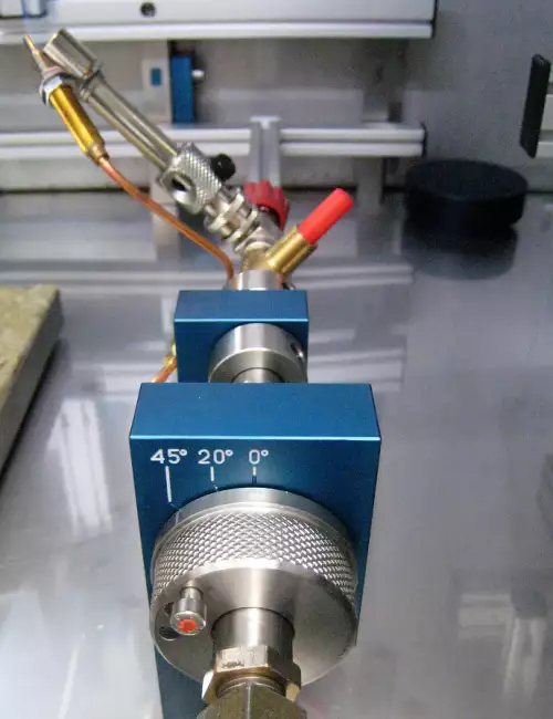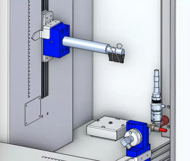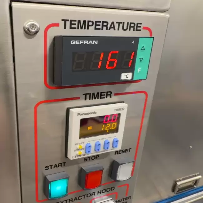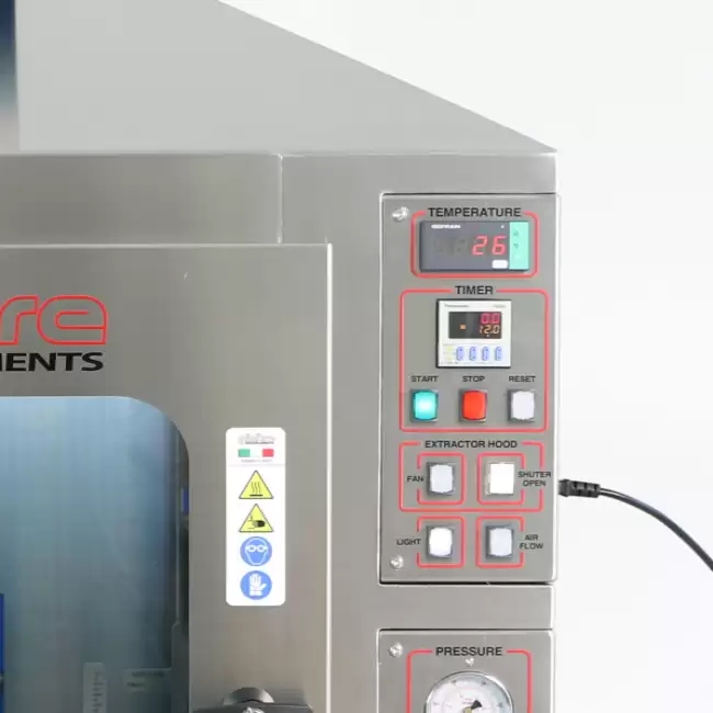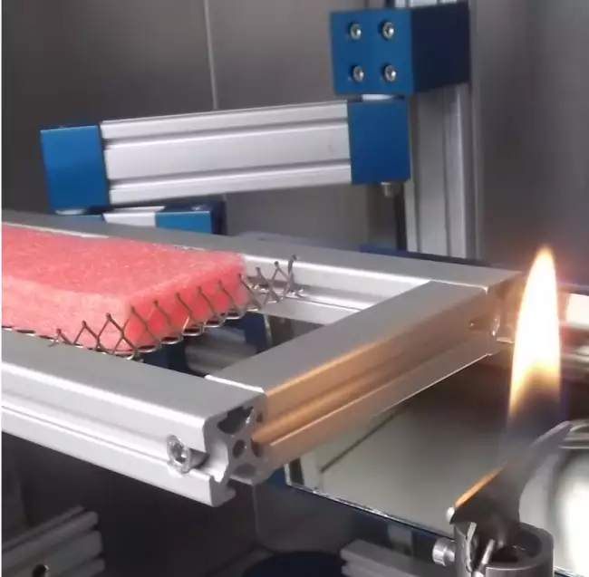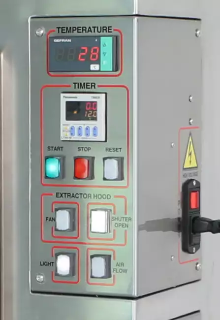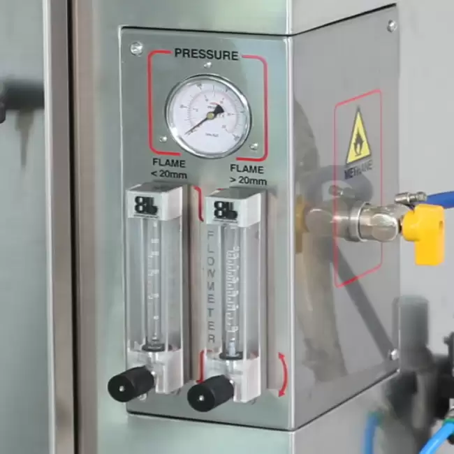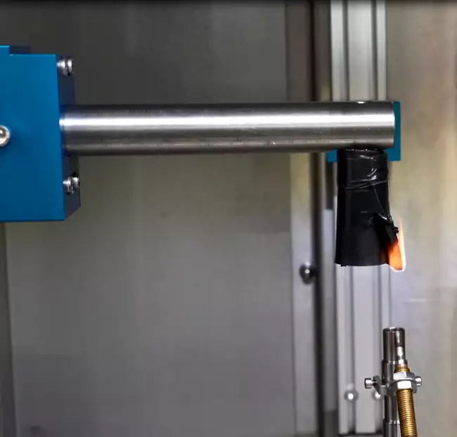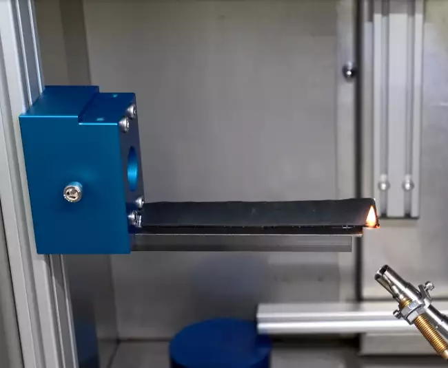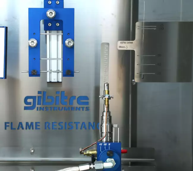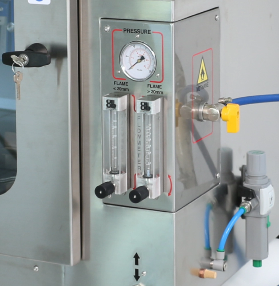 | Types of test that can be performed HBF (Horizontal Burning Foamed Material), HB (Horizontal Burning), MVB (Material Vertical Burning), VB (Vertical Burning) | Test Cabinet Stainless steel with a volume of 0.5 m3 with inspection window and light for internal illumination. | Burner Conforming to ASTM D5025 and CEI IEC 60695-11-4 standards. With support for flame angle set (0°, 20°, 45°). | Temperature Control Internal Digital thermometer in conformity with ASTM D 5207 standard | Gas flow Regulation (Methane) Integrated Flow meter | Timer Digital Timer with 0.1 sec. resolution. The timer permits to set the flame exposition time. At the end of the count down for flame exposition, the timer permits to count flame extinction time. | Slide for the displacement of the Burner during the test The slide, controlled by a pneumatic cylinder, allows the burner to be moved from outside the chamber via the control knob. | Slide for the regulation of the vertical position of the sample The slide, which is controlled by a pneumatic cylinder, allows the distance between the specimen and the flame to be controlled during the execution of the test using the adjustment knob. | Aspiration of Fumes Exhaust fan to remove fumes at the end of the test |