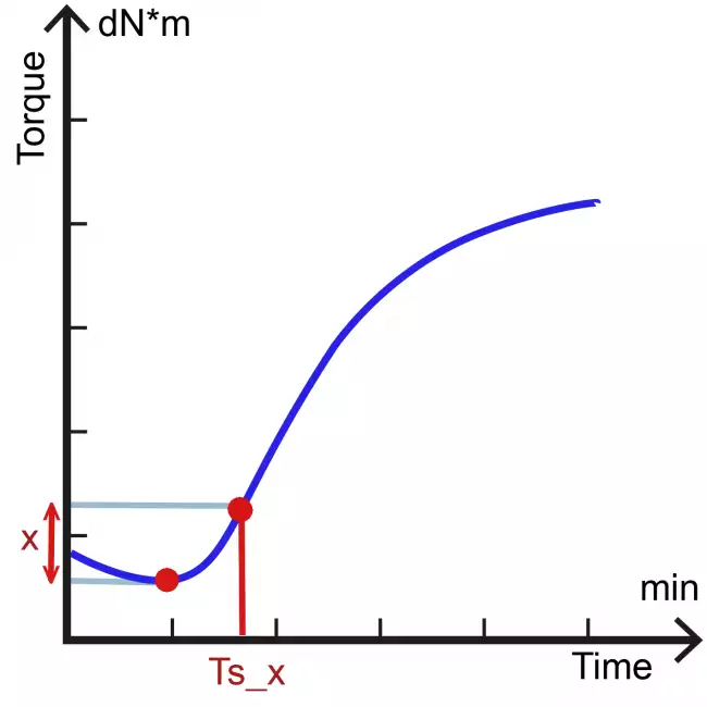 Gibitre software. Formulas for calculating results. Rheo-Check software. Graphical explanation of calculation of Ts_X value (time per scorch of x points).