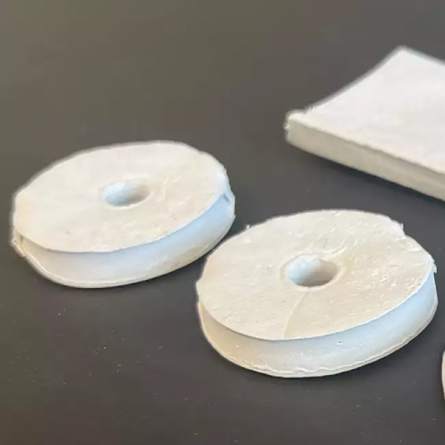 Volumetric die cutter for constant volume specimen preparation for mooney viscometer. Detail of specimens with central hole for rotor insertion.