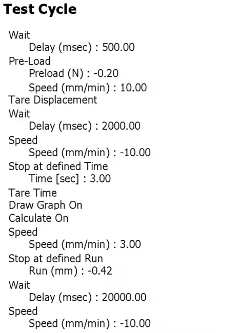 Test Cycle  Customer-defined test cycle with adjustable force-time application  Load Cell  Max load: 50 N, Resolution: 0.001 N  Sample Displacement  Motor controlled screw with ball-screw system. Max speed: 85 mm/min. Stroke: 50 mm. Resolution: 0.0001 mm  Tool for the application of the force  Interchangeable indentor, designed for easy preparation and cleaning of the contact surface