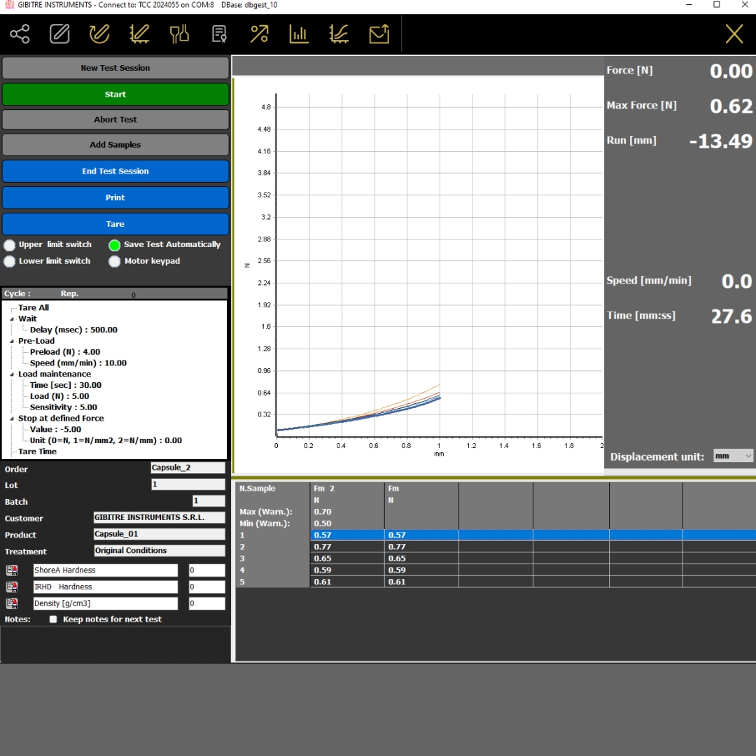 The results and test curves of all the tests carried out are saved in the Gibitre SQL database and are available through the Datagest program.