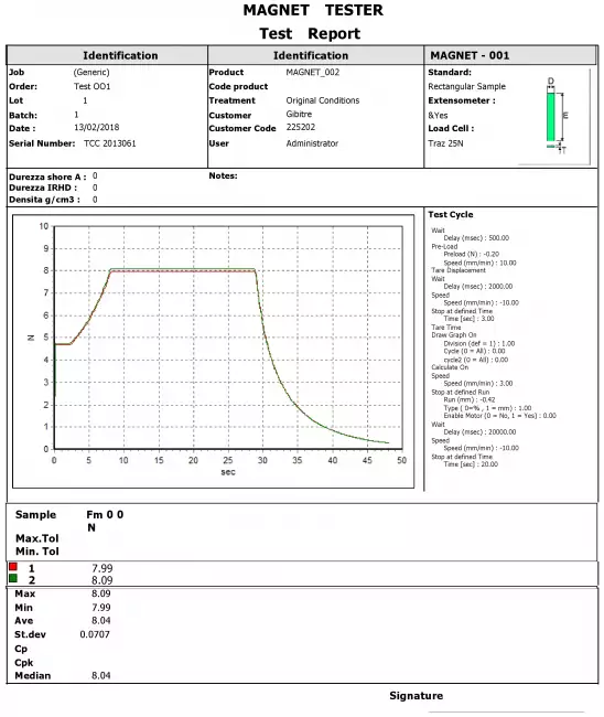 磁化された製品の吸引力を測定するMagnet-Check装置。Tensor-Checkソフトウェアで実現したテストサイクルの例。