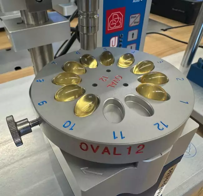 ゲルカプセルの剛性を測定するPharma-Check装置。カプセルを順番に自動テストするプレートの詳細図。