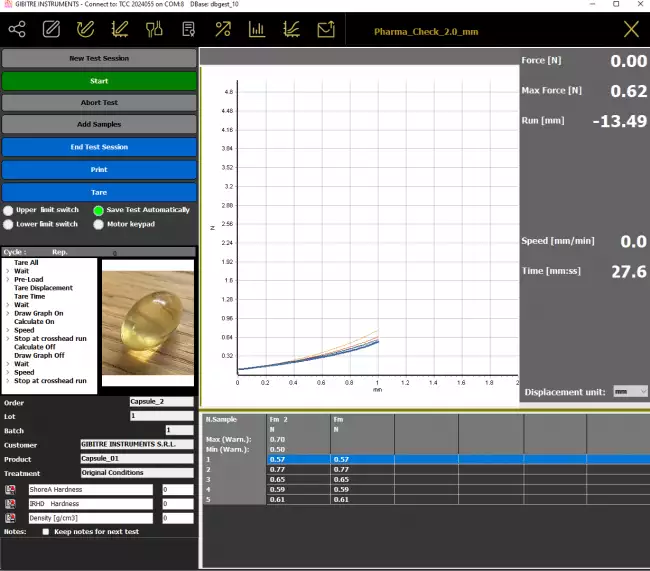 In addition, the software allows the user to prepare different and fully customised test cycles. Customised test cycles can include a different deformation, maintenance of the deformation for a defined time, repetition of the cycle to be applied to the capsule for an adjustable number of times, etc.