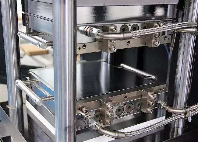 The cooling is performed by means of integrated cooling platens and requires the connection to a water source or a chiller.