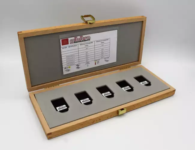 Shape of the samples  The shape of the samples has been developed to permit easy handling without heat transmission to the test area  Protection Box  The wooden box ensures protection against light and temperature variations  Sample identification  The samples have unique identification code to permit the traceability of the calibration  Number of samples  The complete box includes 5 samples. Single samples can be provided  Calibration Report  The calibration report is issued by Gibitre Instruments and includes the traceability to the hardness tester used for the measures.  Duration of the Calibration  12 months
