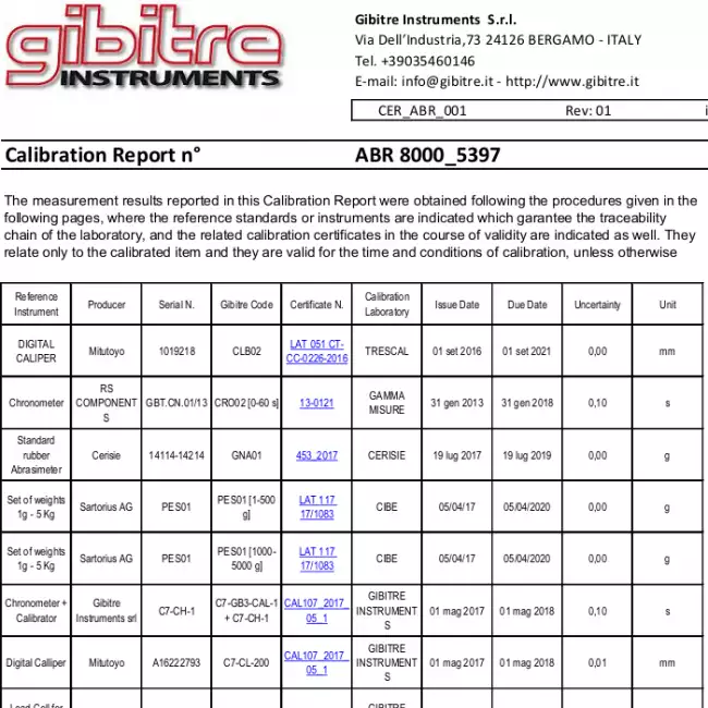 • The Calibration Reports show the complete list of primary and secondary instruments used for the calibration and include the Hyperlink for downloading the relative Calibration Certificate from Gibitre website.