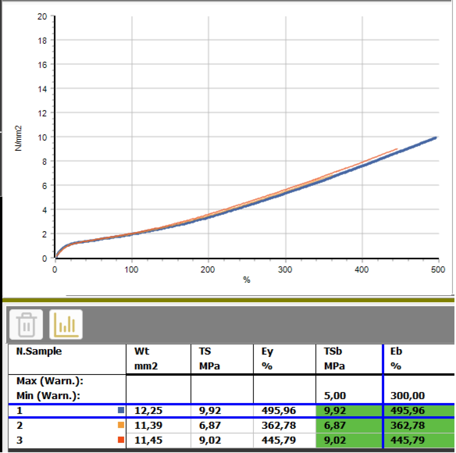 • The curves relating to the tests carried out are shown in different colors to associate them immediately with the relative results.