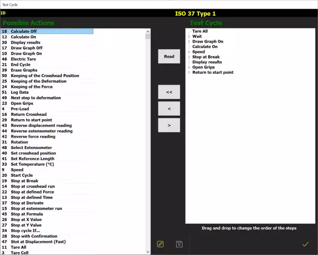 The SQL database that is installed together with the instrument contains a collection of Test Procedures relating to standardized methods for Tensile, Tear, Compression, Peeling tests, etc.