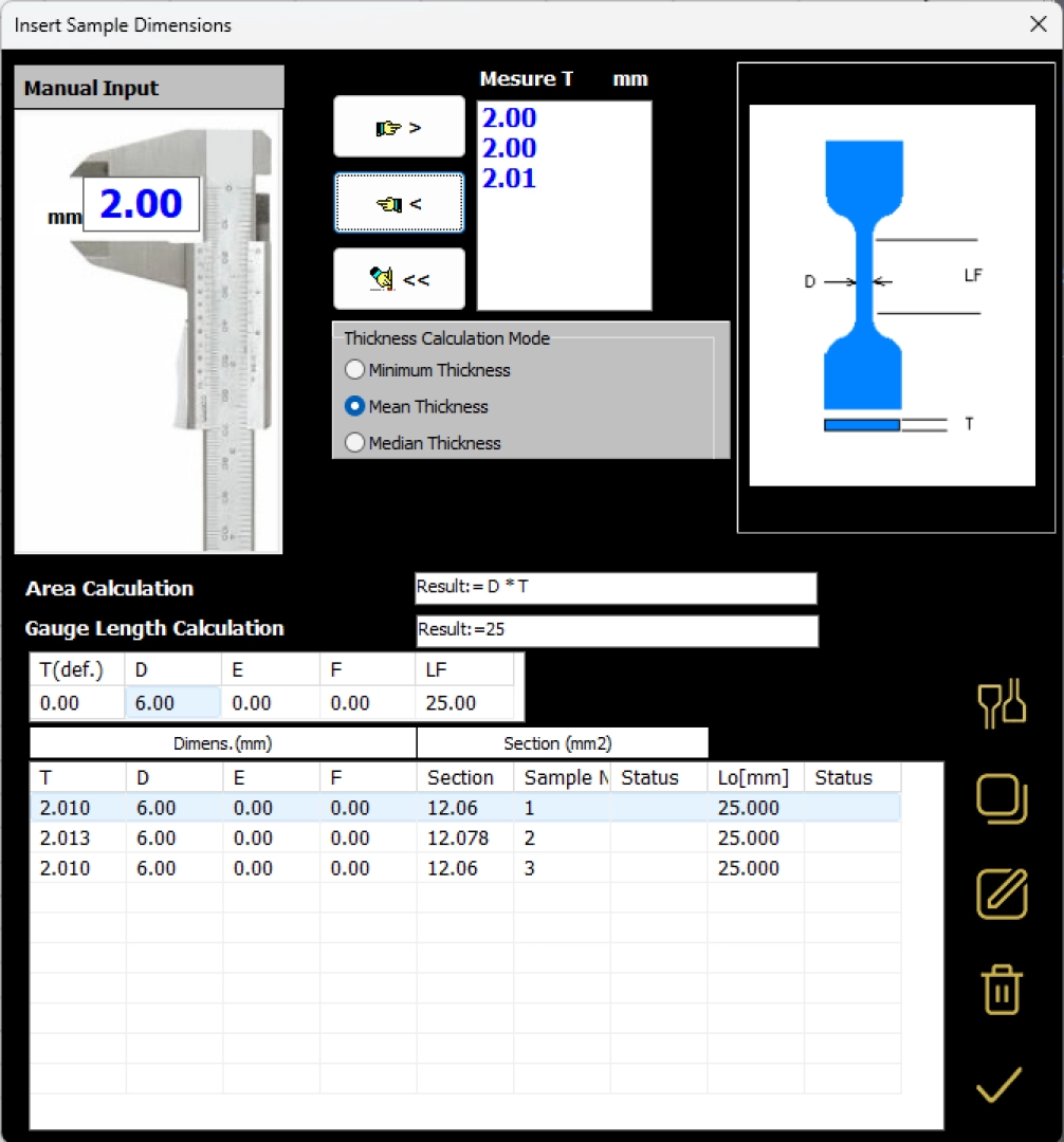 The integration with the thickness gauge allows to insert the section of the whole series of specimens that you have to try in a few seconds.