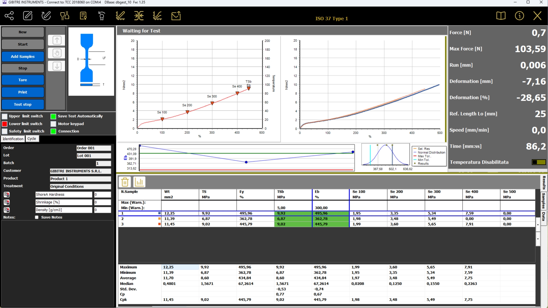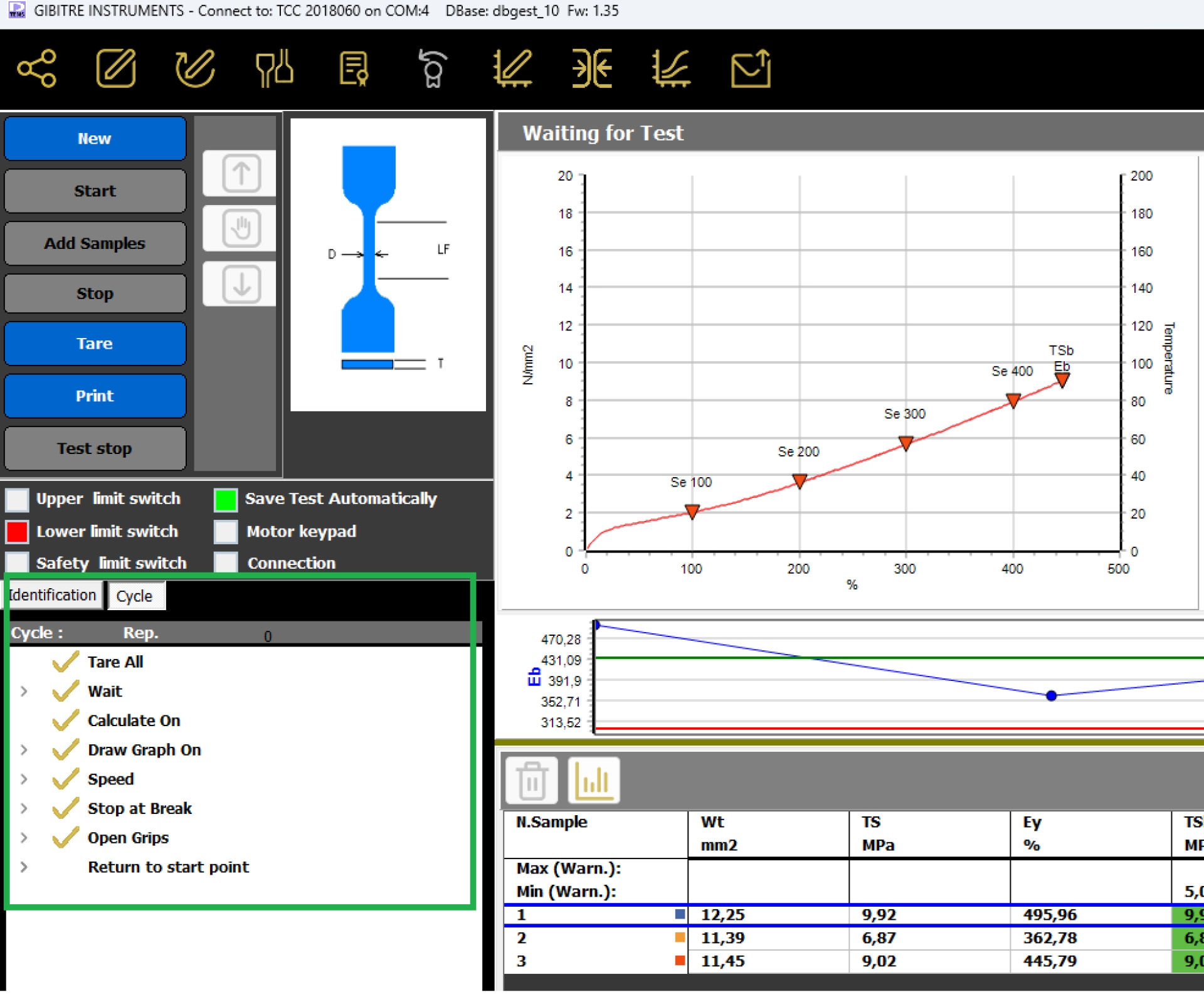 The results and test curves of all the tests carried out are saved in the Gibitre SQL database and are available through the Datagest program.