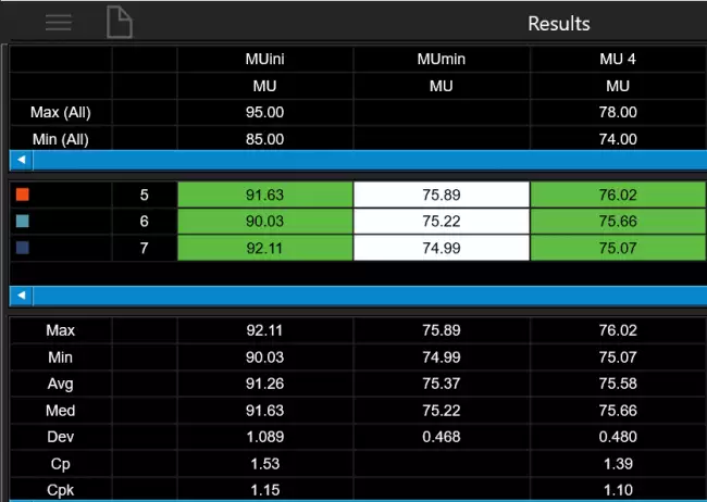 The comparison between the results and the tolerance limits is carried out automatically at the end of each test: the test results are colored (Green, Yellow or Red) based on the outcome of the comparison with the limits.